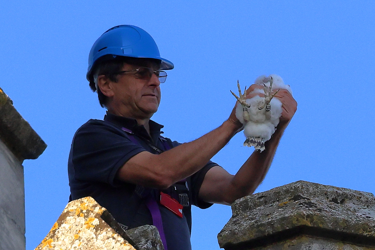 So this evening at the Cathedral after evensong our two little Girls were ringed all went well and they are two very healthy baby girls . Dad came in fairly quickly afterwards to check that all was ok . There will be more pictures tomorrow but for now two pictures thanks to Graham Roberts.